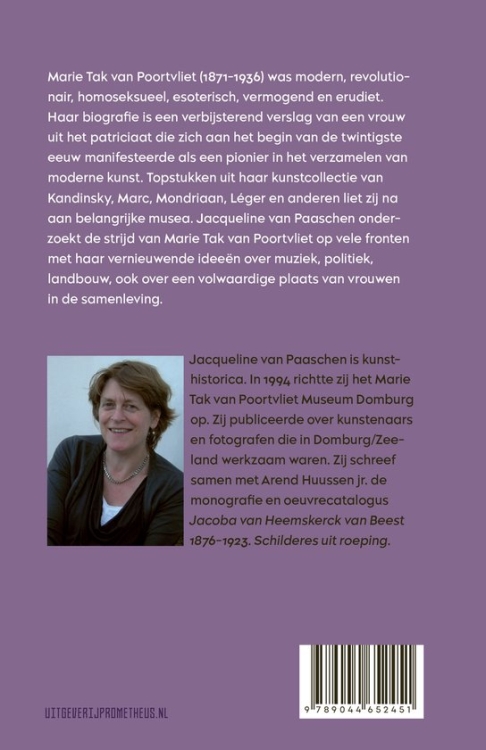Een kloeke (591 p.) en gedetailleerde biografie van de invloedrijke Nederlandse kunstverzamelaar Marie Tak van Poortvliet (1871-1936). Marie Tak van Poortvliet was een pionier in het verzamelen van moderne kunst. Haar collectie omvatte werken van o.a. Kandinsky, Marc, Mondriaan en Léger, die ze naliet aan prominente musea. Het boek belicht haar jeugd in Den Haag, haar hechte relatie met schilderes Jacoba van Heemskerck en haar interesse in moderne kunst en muziek. Ook haar vriendschap met Rudolf Steiner en betrokkenheid bij de antroposofische beweging komt aan bod, evenals haar politieke betrokkenheid tijdens en na de Eerste Wereldoorlog. Nuchter en met oog voor historisch detail geschreven. Met foto's en portretten in zwart-wit. Geschikt voor een brede tot geoefende lezersgroep. Jacqueline van Paaschen is een Nederlands kunsthistorica en oprichter van het Marie Tak van Poortvliet Museum in Domburg. Naar aanleiding van dit boek vindt er in Kunstmuseum Den Haag van juli 2025 tot en met maart 2026 een tentoonstelling plaats over Marie Tak van Poortvliet en Jacoba van Heemskerck.